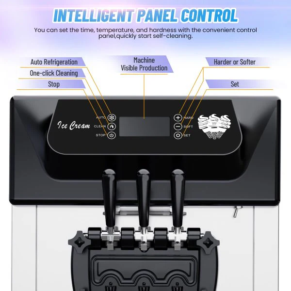 2200W Commercial Ice Cream Machine, 3 Flavor Soft Serve Ice Cream Machine, 5.3-7.4 Gal/Hr, with LCD Touch Screen, Automatic Cleaning, High Productivity for Home Snack Bar & Restaurants