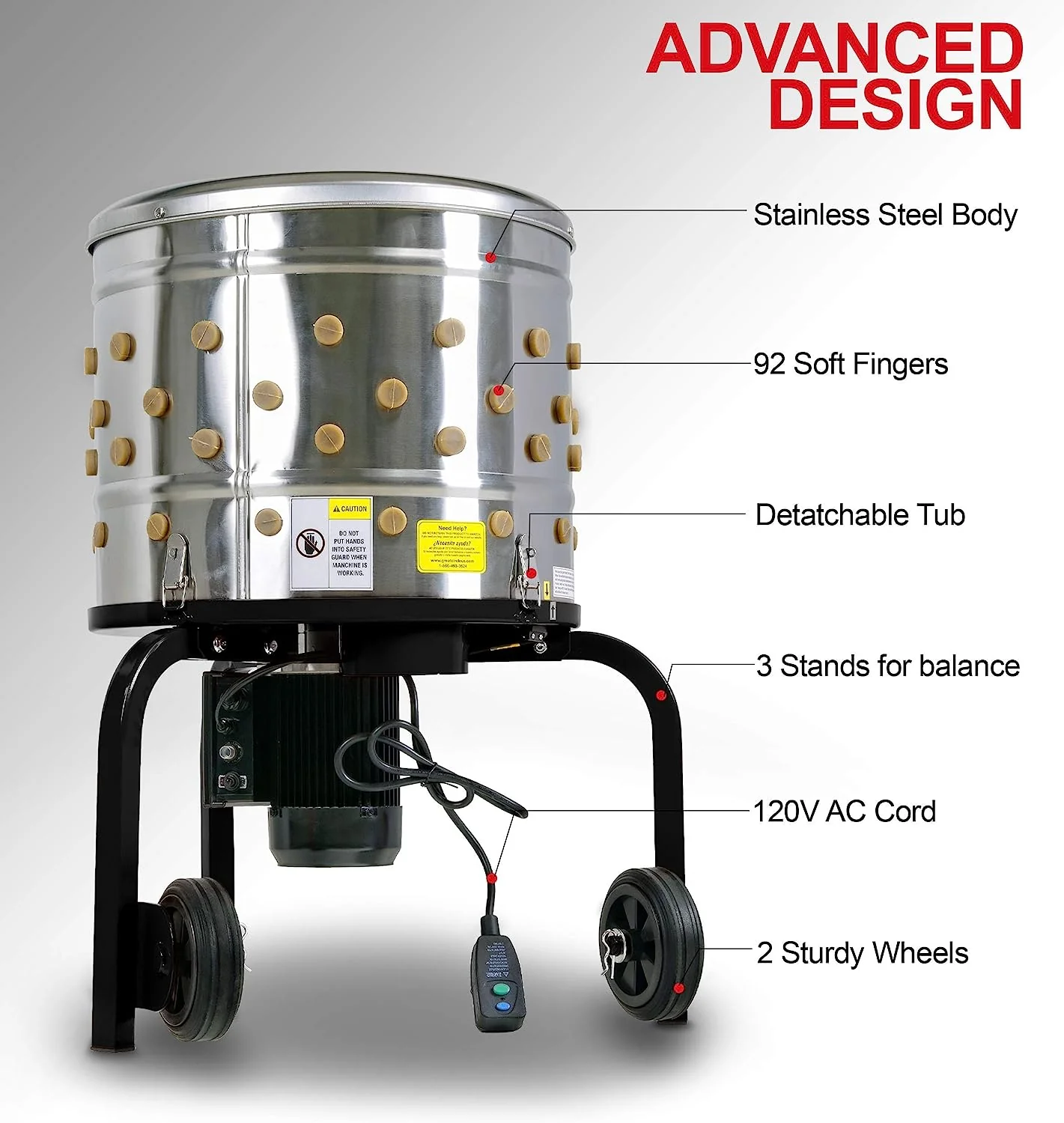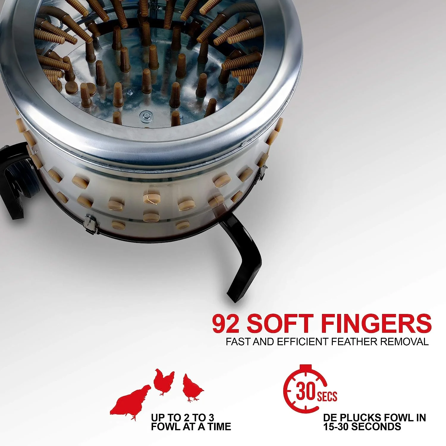 • Kitchener Chicken Plucker De-Feather Remover Poultry and Fowl Food Processor Electric Stainless Steel Heavy Duty 1HP 120VAC 280RPM GFCI Connector 92 Soft Fingers 20" Drum Diameter